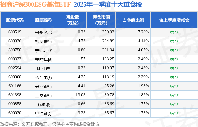 从基金规模来看,招商沪深300ESG基准ETF基金2025年一季度公布的基金规模为0.49亿元,较上一期规模5732.0万元变化了-787.92万元,环比变化了-13.75%。该基金最新一期资产配置为:股票占净值比99.09%,无债券类资产,现金占净值比1.04%。从基金持仓来看城中投资,该基金当季前十大股票仓位达30.01%,第一大重仓股为贵州茅台(600519),持仓占比为7.26%。