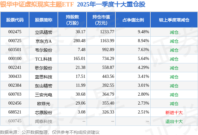 本站消息掌上世界,日前银华中证虚拟现实主题ETF基金公布一季报,2025年一季度最新规模1.3亿元,季度净值涨幅为7.6%。